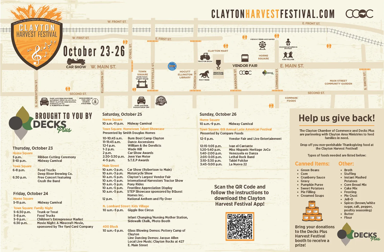 The Clayton Chamber of Commerce and Decks Plus are partnering with Clayton Area Ministries to feed families in need. Drop off your non-perishable Thanksgiving food at the Clayton Harvest Festival! Be sure to bring your donations to the Decks Plus booth. Click image for types of foods needed.